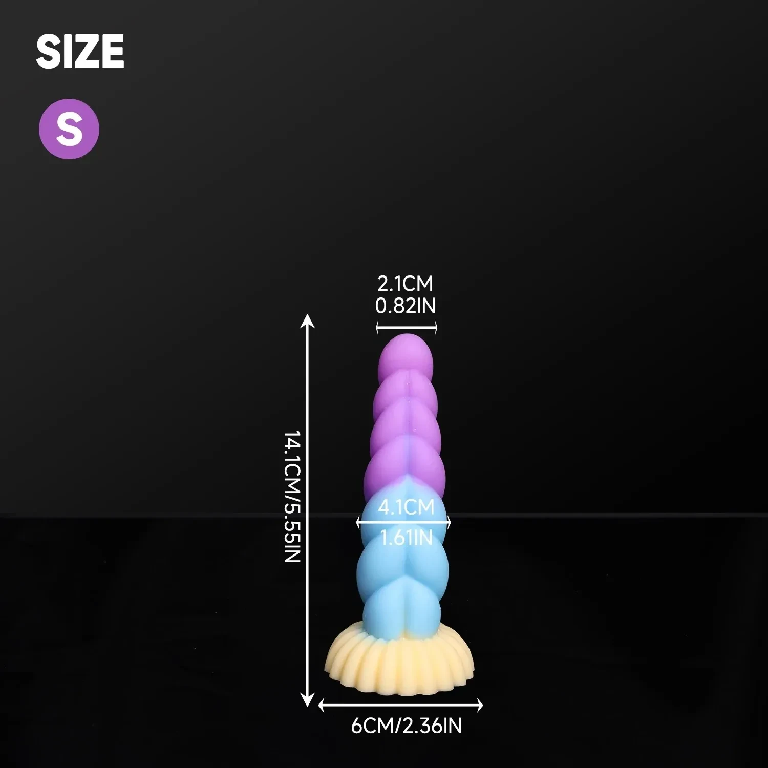 - Size Small: 5.55″ x 0.82″ (14.1cm x 2.1cm) Length, 1.61”(4.1cm) Head Diameter, 2.36″ (6cm) Suction Cup Diameter