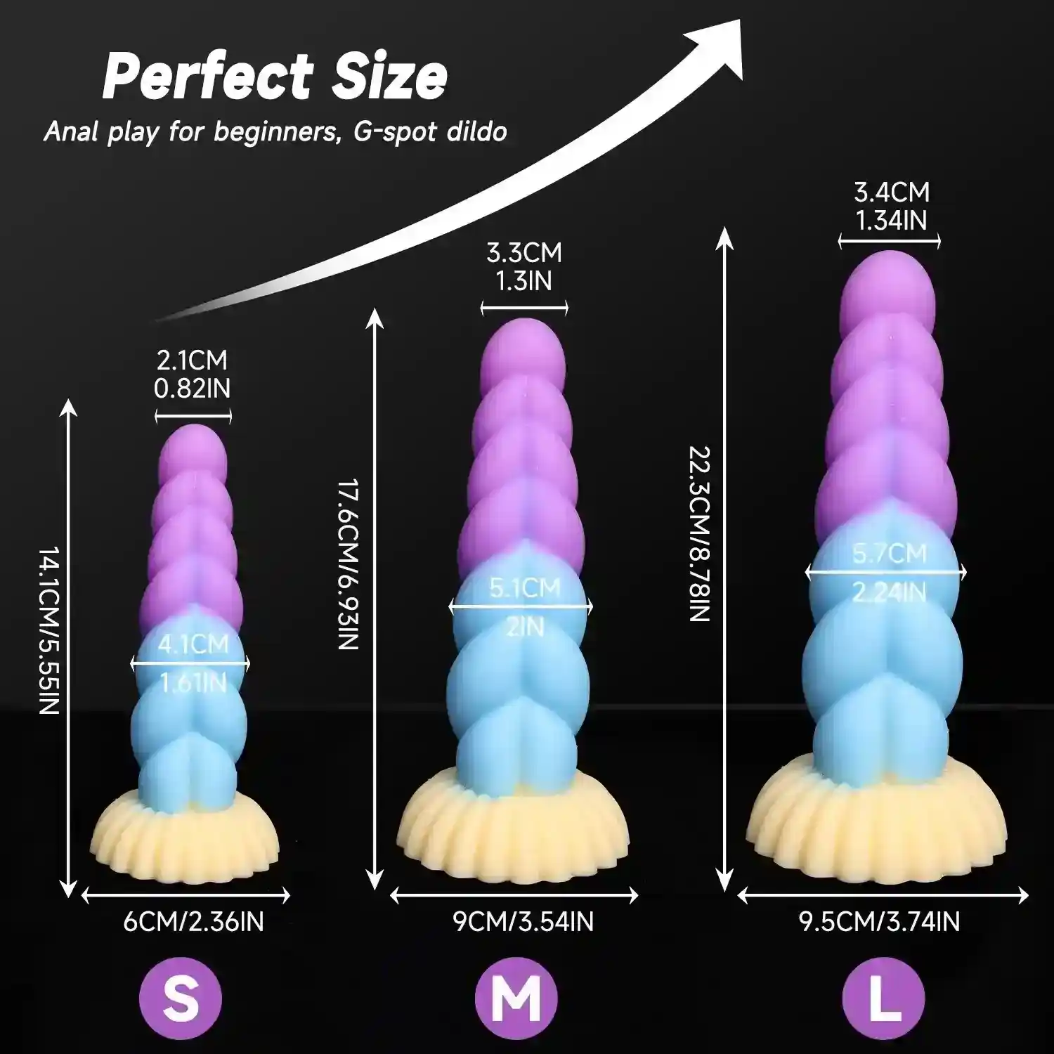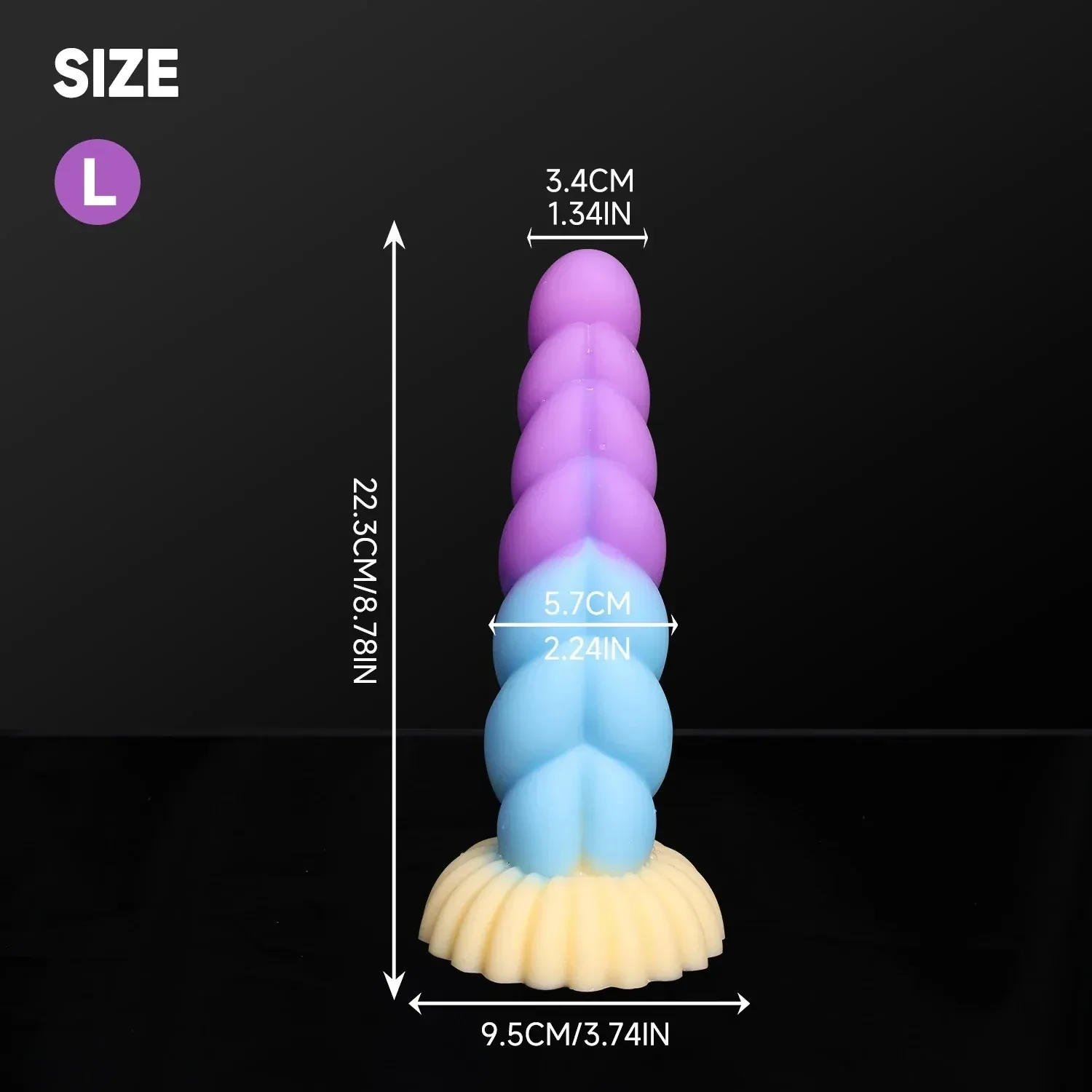 - Size Large: 8.78″ x 1.34″ (22.3cm x 3.4cm) Length, 2.24”(5.7cm) Head Diameter, 3.74″ (9.5cm) Suction Cup Diameter