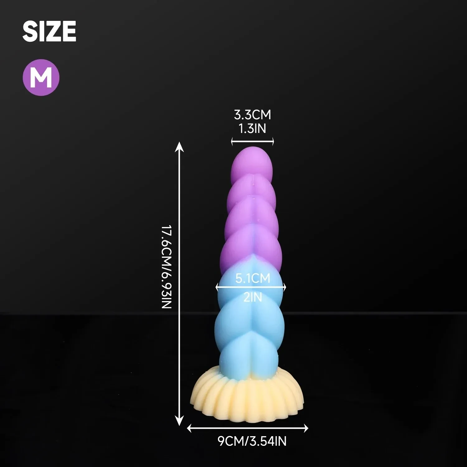 - Size Medium: 6.93″ x 1.3″ (17.6cm x 3.3cm) Length, 2”(5.1cm) Head Diameter, 3.54″ (9cm) Suction Cup Diameter